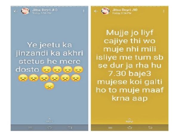 एक में लिखा मेरी उम्मीद और मेरा भरोसा टूट चुका है, इसलिए मुझे अब जीने का कोई हक नहीं। आखिरी व चौथे स्टेटस में लिखा कि ये जीतू का जिंदगी का आखरी स्टेटस है मेरे दोस्तों....। अभी यह साफ नहीं है कि उसके छलांग लगाते समय मौजूद कुछ युवक ये स्टेटस पढ़कर ही उसे बचाने पहुंचे थे या फिर वे अजनबी होकर पहले से मौजूद थे।