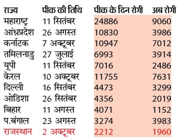 इसके अलावा प्रतिदिन मिलने वाले रोगियों की संख्या में कमी की बात करें तो कई राज्यों में यह आंकड़ा 64% तक है, जबकि राजस्थान में सिर्फ 11% की कमी आई है। महाराष्ट्र में 11 सितंबर को सर्वाधिक 24886 नए रोगी मिले थे। अब महाराष्ट्र में रोज करीब 9060 मिल रहे हैं यानी करीब 64% की कमी हुई है।